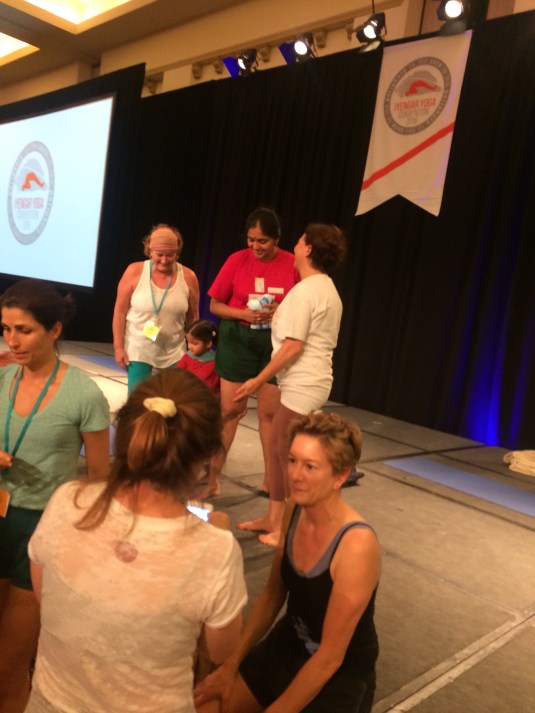 During the Convention, people, Patricia Walden, Manouso Manos, Bobby Clennell, John Shumacher, Lois Steinberg, Geeta, Abhijata, and a few others gave stories of their experiences with Iyengar. Iyengar had died a few years ago. Geeta Iyengar gave thoughts and experiences via the internet. All of the commentaries were very useful in getting an idea of whom Iyengar was like and possibly what he would expect out of his students. Abhijata gave a presentation. The biggest lesson learned from her lecture was that Yoga was more than doing a check list of body movements for an asana. If yoga was solely a checklist, the partitioner would stop growing from the practice. When yoga was done correctly, yoga happened. Questions to ask self, before and after an Asana, ” How do I feel when doing a yogic pose?” “What was missing?” Every time a yogic pose was done, it should be done as if it were being done for the first time, even if; it was done a 1000 times before.